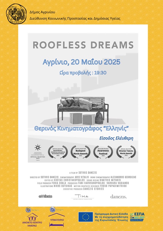 Ο Δήμος Αγρινίου σας προσκαλεί στην προβολή του ντοκιμαντέρ με τίτλο “Roofless Dreams” του Σωτήρη Δανέζη, στις 20 Μαΐου 2025 και ώρα 19:30, στον θερινό κινηματογράφο «Ελληνίς», στην πόλη του Αγρινίου.