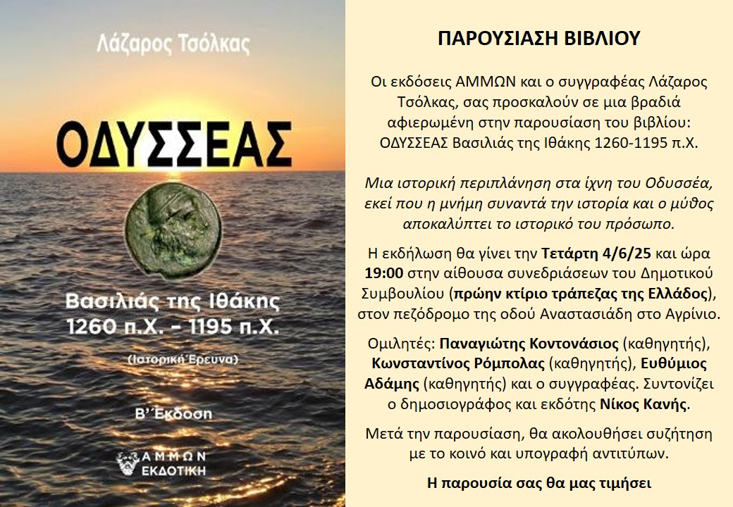 Οι Εκδόσεις ΑΜΜΩΝ και ο συγγραφέας Λάζαρος Τσόλκας, σας προσκαλούν στην παρουσίαση του νέου βιβλίου: ΟΔΥΣΣΕΑΣ – Βασιλιάς της Ιθάκης (1260–1195 π.Χ.) το οποίο αποτελεί μια πρωτότυπη ιστορική έρευνα, καθώς επιχειρεί να φωτίσει την πραγματική ταυτότητα του Οδυσσέα, πέρα από τον μυθολογικό του μανδύα, και να τον εντάξει στον χωροχρόνο της ιστορίας ως ιστορικό πλέον πρόσωπο.
