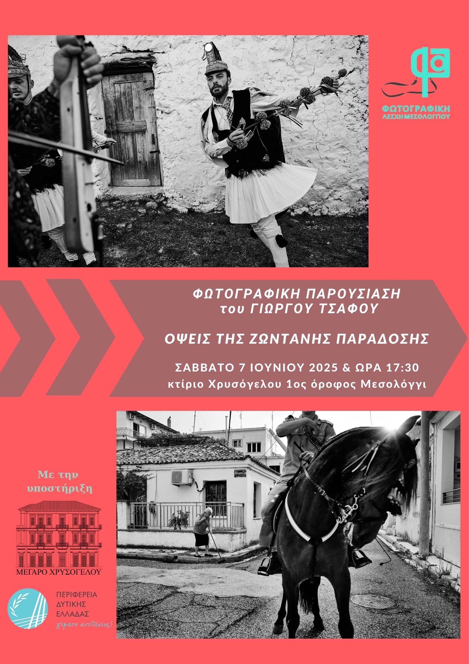 Η Φωτογραφική Λέσχη Μεσολογγίου σας προσκαλεί με χαρά στην παρουσίαση του φωτογράφου Γιώργου Τσάφου με θέμα: «Όψεις της Ζωντανής Παράδοσης» με πλούσιο υλικό από το πανηγύρι του Αη Σημιού και παραδοσιακούς εορτασμούς από όλη την Ελλάδα.