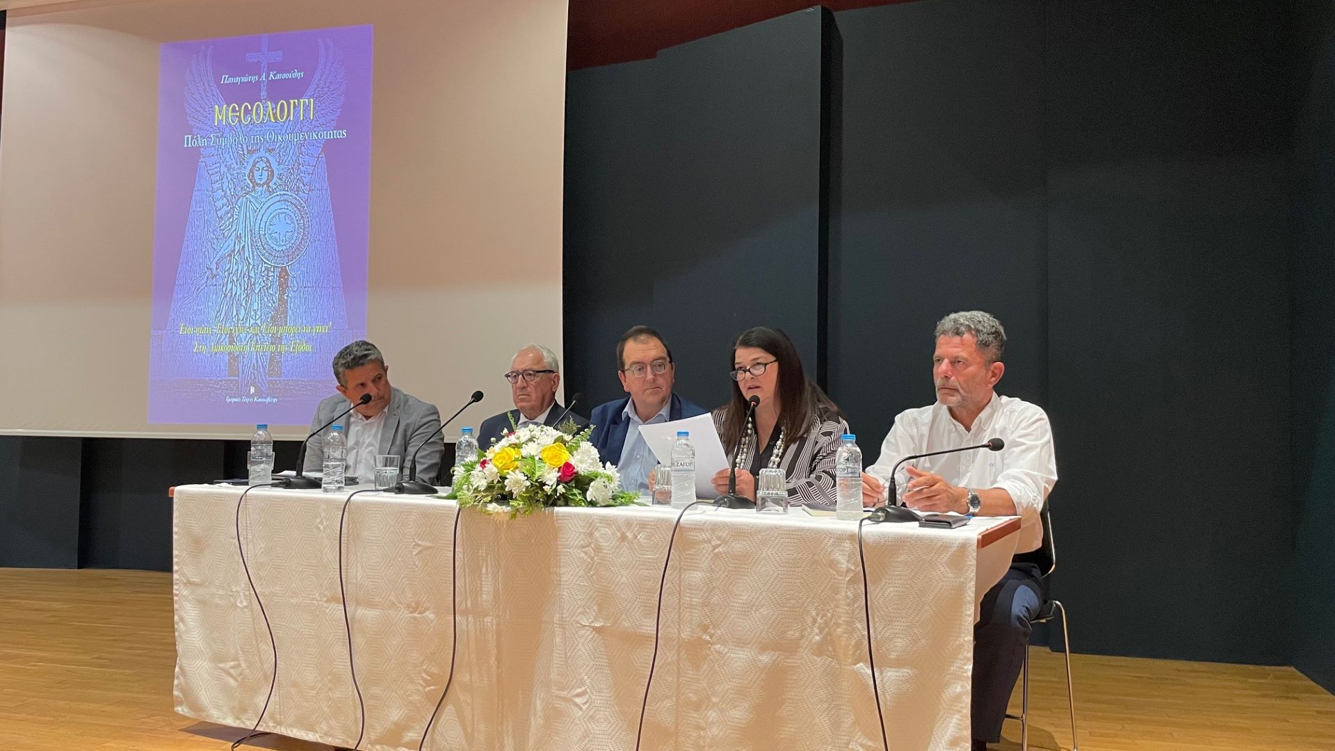 Για το βιβλίο «Μεσολόγγι: Πόλη Σύμβολο της Οικουμενικότητας» μίλησαν η Δέσποινα Κανελλή, Διευθύντρια του Μουσείου Άλατος Μεσολογγίου – Εκπαιδευτικός, ο Γιώργος Παναγιωτόπουλος, Αντιπρύτανης Πανεπιστημίου Πατρών – Καθηγητής Πανεπιστημίου και ο Σπυρίδων Φλογαΐτης, Ομότιμος Καθηγητής Πανεπιστημίου Αθηνών – Διευθυντής του Ευρωπαϊκού Οργανισμού Δημοσίου Δικαίου (EPLO), ενώ το συντονισμό της εκδήλωσης είχε ο δημοσιογράφος Δημήτρης Μαλαβέτας.