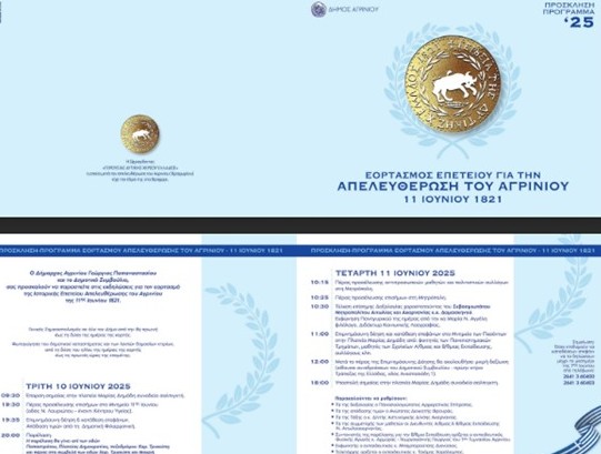 Ο Δήμαρχος Αγρινίου Γιώργος Παπαναστασίου και το Δημοτικό Συμβούλιο, σας προσκαλούν να παραστείτε στις εκδηλώσεις για τον εορτασμό της 11ης Ιουνίου 1821, ιστορικής επετείου Απελευθέρωσης του Αγρινίου.