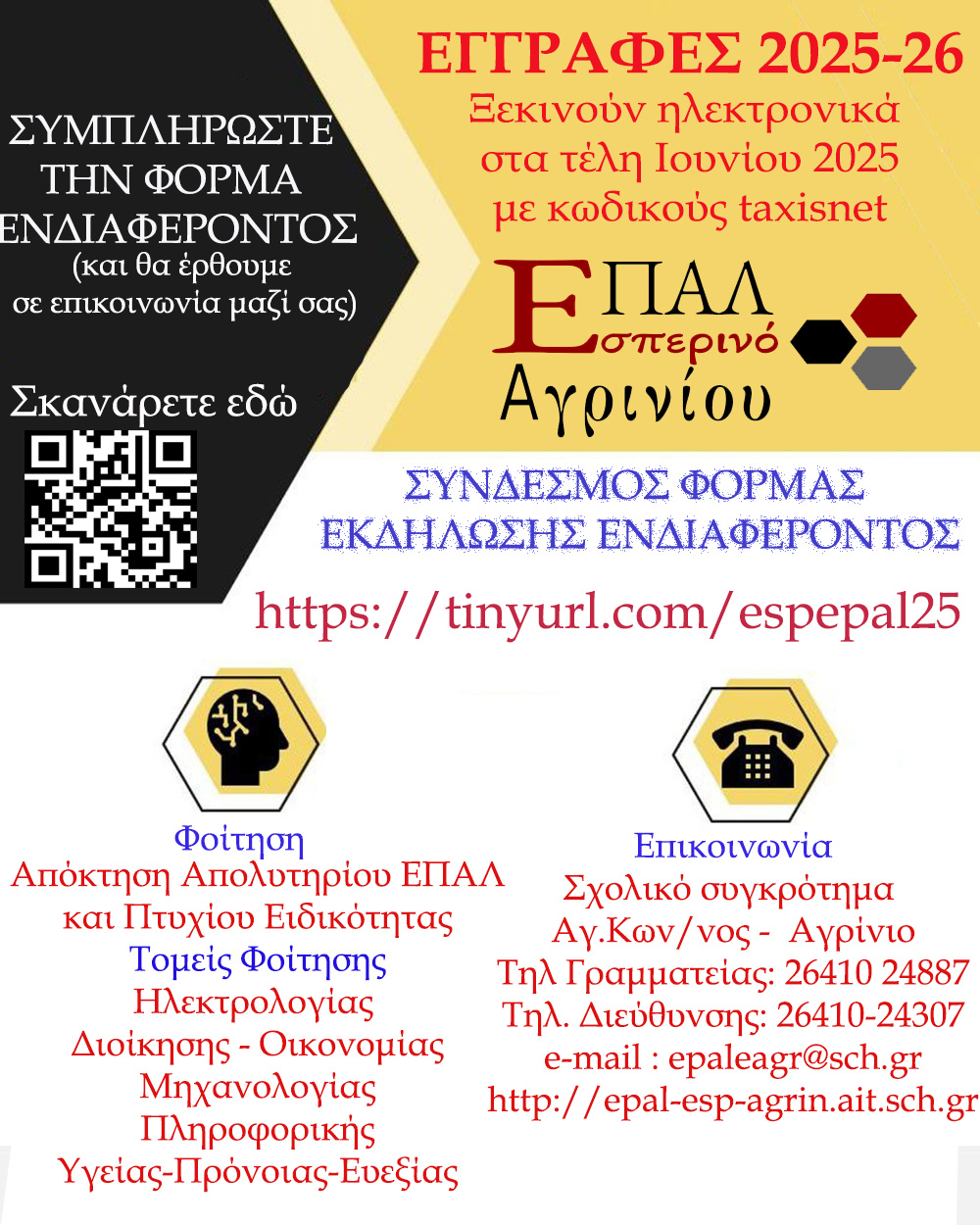 Οι εγγραφές για το σχολικό έτος 2025–2026 αναμένεται να ξεκινήσουν επίσημα στα τέλη Ιουνίου. Για την καλύτερη οργάνωση και προετοιμασία, καλούνται οι ενδιαφερόμενοι να συμπληρώσουν από τώρα τη Φόρμα Εκδήλωσης Ενδιαφέροντος για φοίτηση στο Εσπερινό ΕΠΑ.Λ. Αγρινίου.