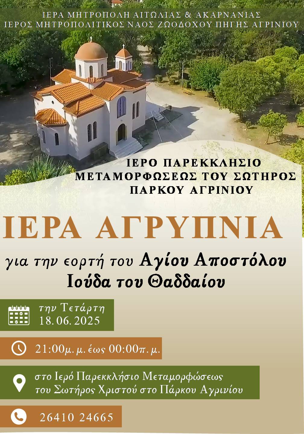 Την Τετάρτη 18 Ιουνίου 2025 στο Ιερό Παρεκκλήσιο Μεταμορφώσεως του Σωτήρος Χριστού Πάρκου Αγρινίου, θα τελεσθεί Ιερά Αγρυπνία για την εορτή του Αγίου Απόστολου Ιούδα του Θαδδαίου.