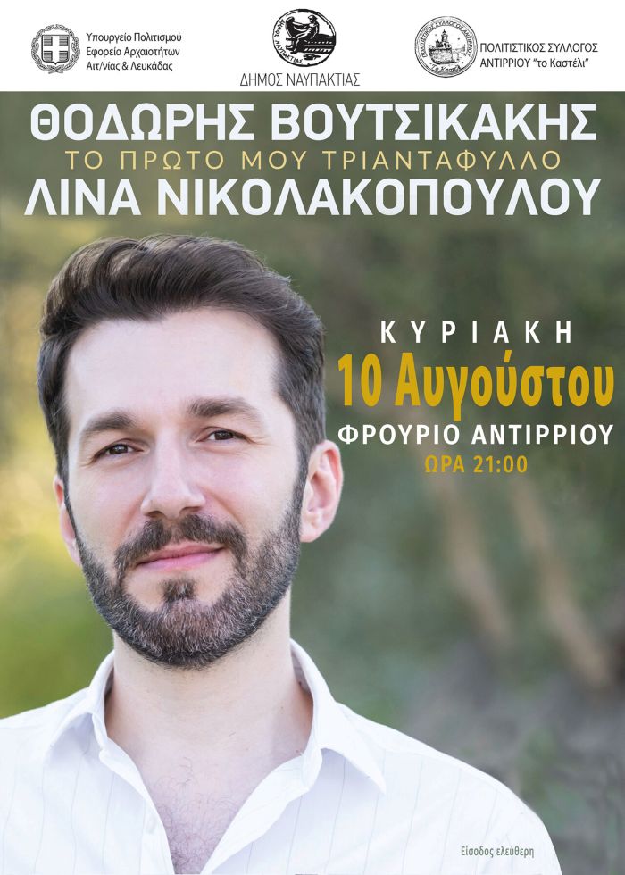 Ο Δήμος Ναυπακτίας παρουσιάζει τη μουσική εκδήλωση «Το πρώτο μου τριαντάφυλλο» με τον Θοδωρή Βουτσικάκη, το Σάββατο 10 Αυγούστου 2025 και ώρα 21:00’, στο εμβληματικό Φρούριο Αντιρρίου.