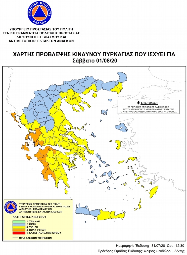 Σε κατηγορία κινδύνου 4 ( πολύ υψηλή) θα βρίσκονται, η Π.Ε. Ηλείας και τμήματα των Π.Ε. Αιτωλοακαρνανίας και Αχαΐας για το Σάββατο 31 Ιουλίου 2020, σύμφωνα με την πρόβλεψη της Γενικής Γραμματείας Πολιτικής Προστασίας, όπως αποτυπώνεται στον επισυναπτόμενο ημερήσιο Χάρτη Πρόβλεψης Κινδύνου Πυρκαγιάς.