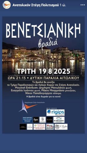 Την Τρίτη 19 Αυγούστου και ώρα 21:00 στη δυτική παραλία Αιτωλικού θα πραγματοποιηθεί βενετσιάνικη βραδιά.
