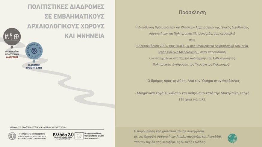 Την Τετάρτη 17 Σεπτεμβρίου και ώρα 8:00 μ.μ. η Διεύθυνση Προϊστορικών και Κλασικών Αρχαιοτήτων της Γενικής Διεύθυνσης Αρχαιοτήτων και Πολιτισμικής Κληρονομιάς σας προσκαλεί στο Ξενοκράτειο Αρχαιολογικό Μουσείο Ιεράς Πόλεως Μεσολογγίου, στην παρουσίαση των ενταγμένων στο Ταμείο Ανάκαμψης και Ανθεκτικότητας Πολιτιστικών Διαδρομών του Υπουργείου Πολιτισμού: