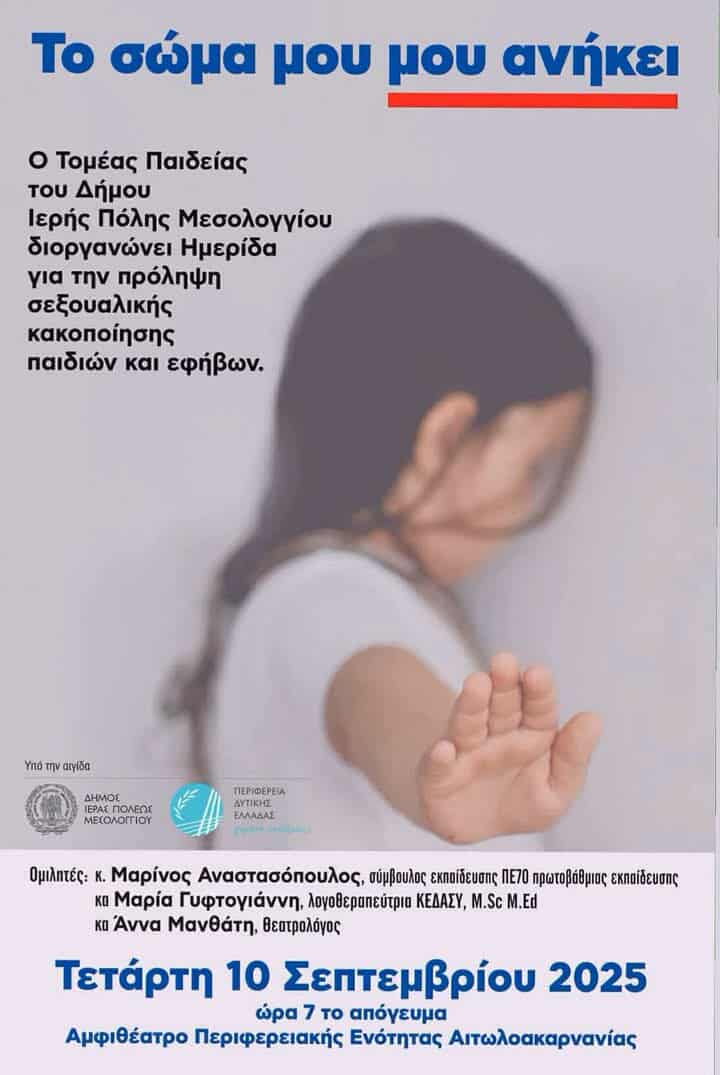 Ο Τομέας Παιδείας του Δήμου Ιερής Πόλης Μεσολογγίου διοργανώνει την ημερίδα «Το σώμα μου μου ανήκει», την Τετάρτη, 10 Σεπτεμβρίου 2025 στις 19:00, στο Αμφιθέατρο της Περιφερειακής Ενότητας Αιτωλοακαρνανίας (Κύπρου 30, Μεσολόγγι).