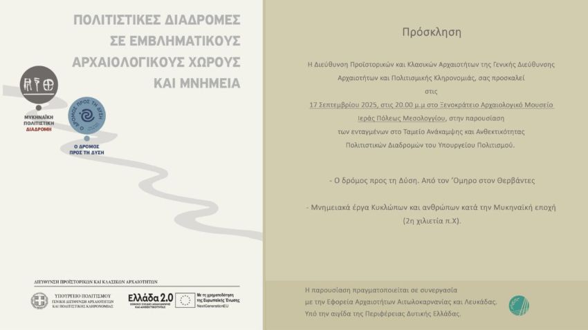 Η εκδήλωση θα πραγματοποιηθεί την Τετάρτη 17 Σεπτεμβρίου και ώρα 8:00 μ.μ. στο Ξενοκράτειο Αρχαιολογικό Μουσείο Μεσολογγίου και οι διαδρομές που αφορά είναι: