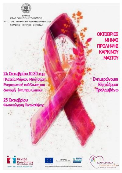 Η ενημέρωση και ο τακτικός προληπτικός έλεγχος μπορούν να σώσουν ζωές. Για το λόγο αυτό, το Αυτοτελές Τμήμα Κοινωνικής Προστασίας με τις Κοινωνικές Δομές (Κέντρο Κοινότητας, Κοινωνικό Παντοπωλείο, ΚΗΦΗ, Βοήθεια στο Σπίτι) και σε συνεργασία με τη Δημοτική Επιτροπή Ισότητας των Φύλων του Δήμου Ιερής Πόλης Μεσολογγίου, θα βρίσκεται εκεί για να μοιραστεί χρήσιμες πληροφορίες και να ενισχύσει την ευαισθητοποίηση όλων μας.