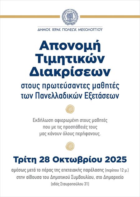 Σας προσκαλούμε να τιμήσετε με την παρουσία σας την εκδήλωση απονομής τιμητικών διακρίσεων στους πρωτεύσαντες μαθητές των Πανελλαδικών Εξετάσεων, η οποία θα πραγματοποιηθεί την Τρίτη, 28 Οκτωβρίου 2025, αμέσως μετά το πέρας της επετειακής παρέλασης (περίπου 12:00 μ.μ.).