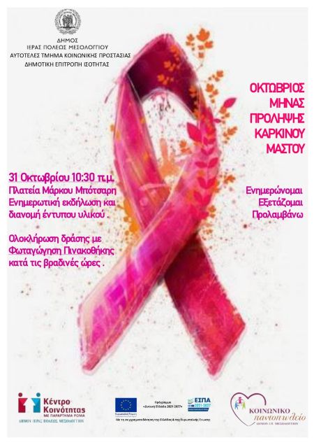 Το Αυτοτελές Τμήμα Κοινωνικής Προστασίας και η Δημοτική Επιτροπή Ισότητας των Φύλων του Δήμου Ιερής Πόλης Μεσολογγίου, σας προσκαλούν να συμμετάσχετε στη δράση ενημέρωσης για την πρόληψη του καρκίνου του μαστού, που προγραμματίστηκε εκ νέου και θα πραγματοποιηθεί την Παρασκευή, 31 Οκτωβρίου, στις 10:30 π.μ., στην κεντρική πλατεία Μάρκου Μπότσαρη στο Μεσολόγγι, με αφορμή την Παγκόσμια Ημέρα κατά του Καρκίνου του Μαστού.