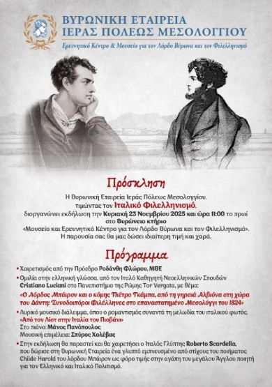 Η Βυρωνική Εταιρεία Ιεράς Πόλεως Μεσολογγίου, τιμώντας τον Ιταλικό Φιλελληνισμό, διοργανώνει εκδήλωση την Κυριακή 23 Νοεμβρίου 2025 και ώρα 11:00 το πρωί στο Βυρώνειο κτήριο «Μουσείο και Ερευνητικό Κέντρο για τον Λόρδο Βύρωνα και τον Φιλελληνισμό».