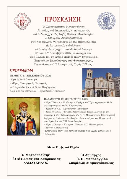 Ὁ Σεβασμιώτατος Μητροπολίτης Αἰτωλίας καὶ Ἀκαρνανίας κ. Δαμασκηνὸς καὶ ὁ Δήμαρχος τῆς Ἱερᾶς Πόλεως Μεσολογγίου κ. Σπυρίδων Διαμαντόπουλος σᾶς προσκαλοῦν νὰ τιμήσετε μὲ τὴν παρουσία σας τὶς λατρευτικὲς ἐκδηλώσεις, οἱ ὁποῖες θὰ πραγματοποιηθοῦν τὸ διήμερο 11ης καὶ 12ης Δεκεμβρίου 2025, μὲ ἀφορμὴ τὴν Ἱερὰ Μνήμη τοῦ ἐν Ἁγίοις Πατρὸς ἡμῶν Σπυρίδωνος, Ἐπισκόπου Τριμυθοῦντος τοῦ Θαυματουργοῦ, Προστάτου καὶ Πολιούχου τῆς Ἱερᾶς Πόλεως.