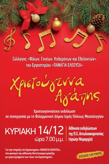 Ο Σύλλογος «Φίλων, Γονέων, Κηδεμόνων και Εθελοντών» του Εργαστηρίου «Παναγία Ελεούσα», σε συνεργασία με τη Φιλαρμονική Δήμου Ιεράς Πόλεως Μεσολογγίου «Χρήστος Καψάλης», προσκαλεί τους πολίτες να παρακολουθήσουν τη Χριστουγεννιάτικη εκδήλωση «Χριστούγεννα Αγάπης», η οποία θα πραγματοποιηθεί την Κυριακή, 14 Δεκεμβρίου 2025 και ώρα 19:00, στην Αίθουσα Εκδηλώσεων της Περιφερειακής Ενότητας Αιτωλοακαρνανίας (πρώην Νομαρχία).
