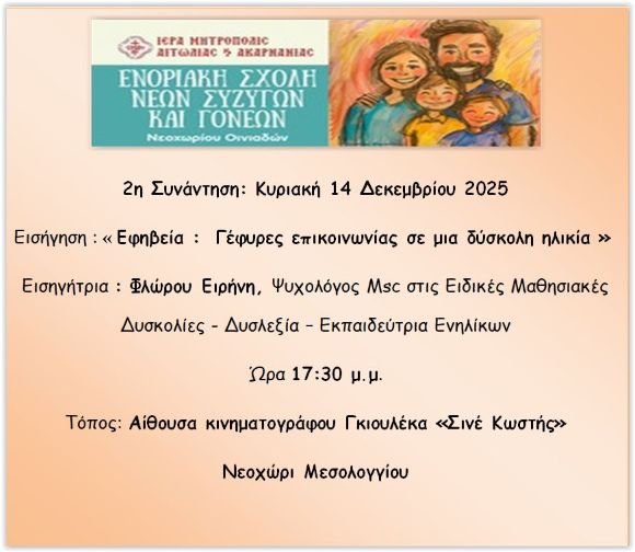 Η Ενοριακή Σχολή Νέων Ζευγαριών και Γονέων Νεοχωρίου Οινιαδών της Ιεράς Μητροπόλεως Αιτωλίας και Ακαρνανίας διοργάνωσε με επιτυχία τον αγιασμό και την έναρξη του νέου κύκλου συναντήσεων την Κυριακή 2 Νοεμβρίου 2025.