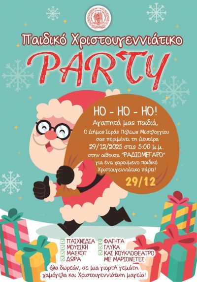 Ο Δήμος Ιερής Πόλης Μεσολογγίου προσκαλεί όλα τα παιδιά και τις οικογένειές τους να παραστούν στο Παιδικό Χριστουγεννιάτικο Πάρτι που διοργανώνει, τη Δευτέρα 29 Δεκεμβρίου 2025, και ώρα 17:00, στην αίθουσα «ΡΑΔΙΟΜΕΓΑΡΟ».