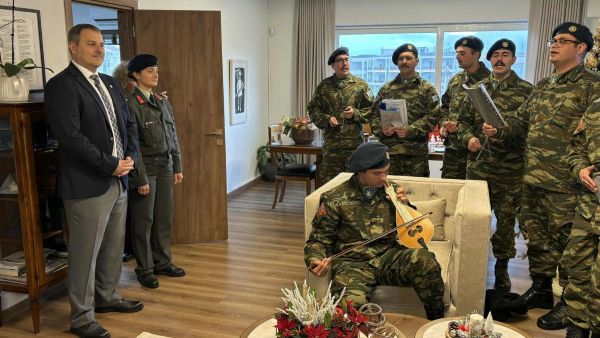 Αμέσως μετά ακολούθησε χορωδία δέκα στρατιωτών του 2/39 Συντάγματος Ευζώνων Μεσολογγίου, συνοδευόμενων από την Ανθυπολοχαγό Πεζικού κα Αγγελική Μπακή. Με κρητική λύρα και βαρύτονο, τα κάλαντα ακούστηκαν με έναν διαφορετικό ήχο, που κέρδισε το ενδιαφέρον και το χειροκρότημα όσων βρέθηκαν στο Δημαρχείο.