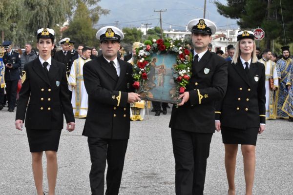 Στη συνέχεια, υπό τους ήχους της Δημοτικής Φιλαρμονικής του Δήμου Ιεράς Πόλεως Μεσολογγίου «Χρήστος Καψάλης», σχηματίστηκε λιτανευτική πομπή προς το λιμάνι, όπου τελέστηκε η Ακολουθία του Καθαγιασμού των Υδάτων και πραγματοποιήθηκε η κατάδυση του Τιμίου Σταυρού.