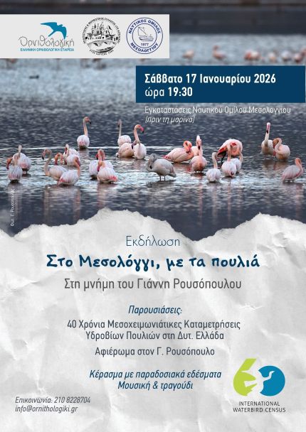 Η εκδήλωση, που είναι ανοιχτή για το κοινό, υλοποιείται από την Ελληνική ΟΡΝΙΘΟΛΟΓΙΚΗ Εταιρεία σε συνεργασία με τον Πολιτιστικό & Μορφωτικό Σύλλογο "Το Αιτωλικό" και τον Ναυτικό Όμιλο Μεσολογγίου. Θα περιλαμβάνει παρουσιάσεις για τα 40 χρόνια Μεσοχειμωνιάτικων Καταμετρήσεων Υδροβίων Πουλιών στη Δυτ. Ελλάδα και τη δράση του Γ. Ρουσόπουλου, καθώς και κέρασμα με παραδοσιακά εδέσματα.