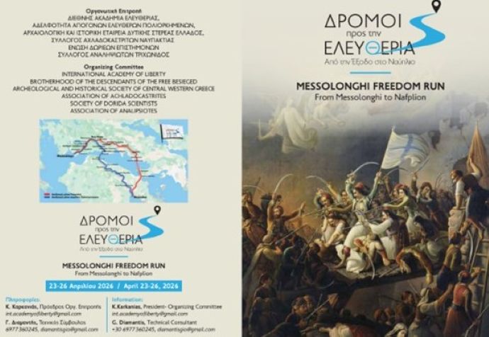 Προκηρύσσουμε την οργάνωση του 1ΟΥ ΔΡΟΜΟΥ ΕΛΕΥΘΕΡΙΑΣ από το Μεσολόγγι στο Ναύπλιο, μήκους 439,2 χιλιομέτρων, από τις 23 έως τις 27 Απριλίου 2026.