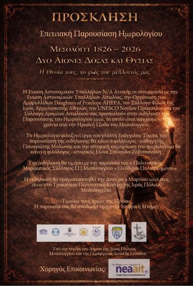 Η Ένωση Αστυνομικών Υπαλλήλων Νοτιοανατολικής Αττικής σε συνεργασία με την Ένωση Αστυνομικών Υπαλλήλων Αιτωλίας ανακοινώνει την επίσημη παρουσίαση του Ημερολογίου για το έτος 2026 με τίτλο «Μεσολόγγι 1826-2026 ΔΥΟ ΑΙΩΝΕΣ ΔΟΞΑΣ ΚΑΙ ΘΥΣΙΑΣ Η Θυσία τους, το φως του μέλλοντος μας» με έργα του γλύπτη Ευάγγελου Τύμπα, η οποία θα πραγματοποιηθεί τη Δευτέρα 9 Μαρτίου 2026 και ώρα 18:00, στο Τρικούπειο Πολιτιστικό Κέντρο, στην Ιερά Πόλη Μεσολογγίου.