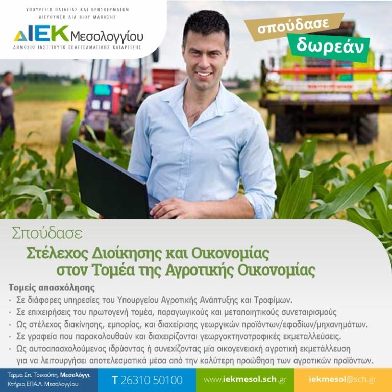 Το ΔΙΕΚ Μεσολογγίου συνεχίζοντας την προσπάθεια δημιουργίας νέων ειδικοτήτων με άμεση εφαρμογή και επαγγελματική αποκατάσταση στην περιοχή φέτος πρότεινε τη λειτουργία της ειδικότητας Στέλεχος Διοίκησης και Οικονομίας στον Τομέα της Αγροτικής Οικονομίας.