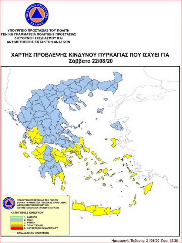 Στην κατηγορία κινδύνου 3 (υψηλή) θα βρίσκεται η Δυτική Ελλάδα το Σάββατο 22 Αυγούστου 2020, σύμφωνα με την πρόβλεψη της Γενικής Γραμματείας Πολιτικής Προστασίας όπως αποτυπώνεται στον επισυναπτόμενο ημερήσιο Χάρτη Πρόβλεψης Κινδύνου Πυρκαγιάς.