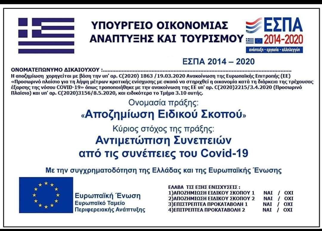 2) Σύμφωνα με την υπ’Αριθμ. 39162 ΕΞ 2020 Κοινή Υπουργική Απόφαση (ΦΕΚ Β' 1457/16-04-2020), όλες οι επιχειρήσεις που έλαβαν αποζημίωση ειδικού σκοπού πρέπει να έχουν αναρτημένη την συνημμένη ΑΦΙΣΑ.