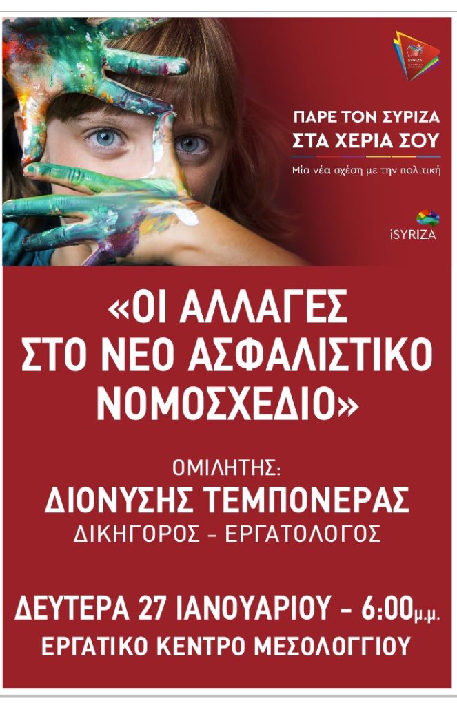 Κάλεσμα από τον Σύριζα Μεσολογγίου, στην ανοιχτή εκδήλωση που διοργανώνει, την Δευτέρα 27 Ιανουαρίου και ώρα 18.00 στο Εργατικό Κέντρο Μεσολογγίου με θέμα «οι αλλαγές στο νέο Ασφαλιστικό Νομοσχέδιο» και ομιλητή τον Δικηγόρο – Εργατολόγο κ. Διονύση Τεμπονέρα.
