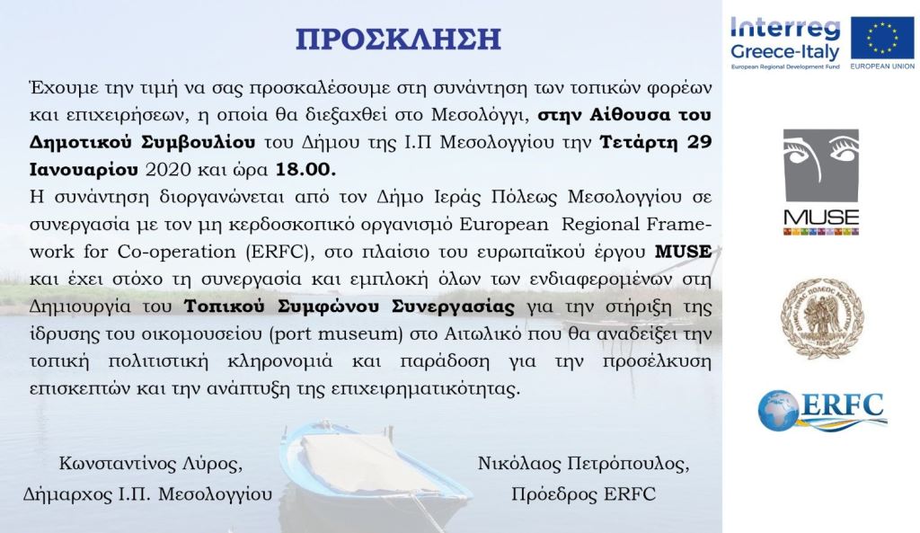 Η Συνάντηση γίνεται στο πλαίσιο του ευρωπαϊκού έργου MUSE κι έχει στόχο τη συνεργασία και την εμπλοκή όλων των ενδιαφερομένων στην δημιουργία του Τοπικού Συμφώνου Συνεργασίας για την στήριξη της ίδρυσης του οικομουσείου (PortMuseum) στο Αιτωλικό, το οποίο έχει ως σκοπό την ανάδειξη της τοπικής αλιευτικής και ναυτικής κληρονομιάς και παράδοσης.