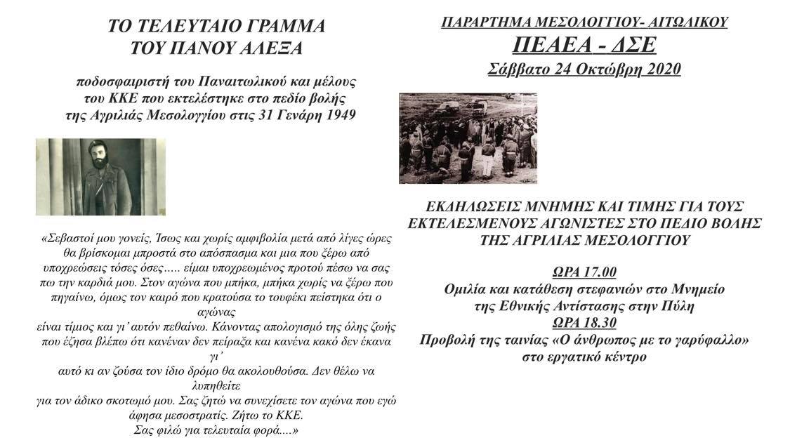 Το παράρτημα Μεσολογγίου - Αιτωλικού της ΠΕΑΕΑ-ΔΣΕ σας προσκαλεί στις εκδηλώσεις μνήμης και τιμής για τους εκτελεσμένους αγωνιστές, στο πεδίο βολής της Αγριλιάς Μεσολογγίου, κατά την περίοδο του εμφυλίου πολέμου, που θα πραγματοποιηθούν στις 24 Οκτώβρη 2020, στις 17:00, στο Μνημείο της Εθνικής Αντίστασης στην Πύλη της Εξόδου και στις 18:30 στο εργατικό κέντρο Μεσολογγίου, με την προβολή της ταινίας