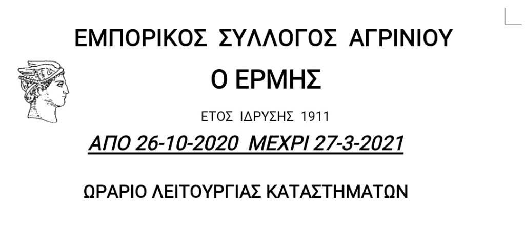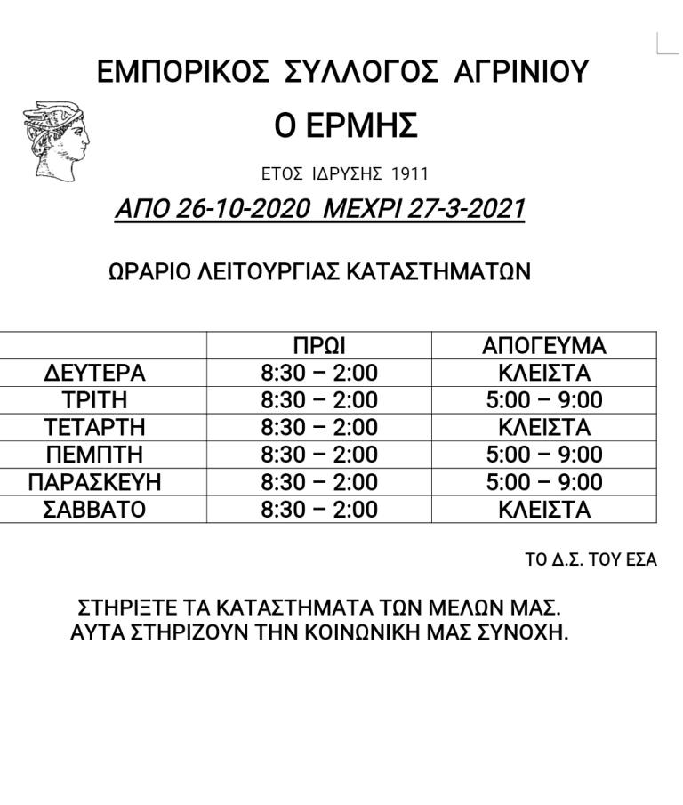 Από την Δευτέρα 26 Οκτωβρίου έως και 27 Μαρτίου αλλάζει το ωράριο των καταστημάτων στην περιοχή του Αγρινίου και διαμορφώνεται ως εξής: