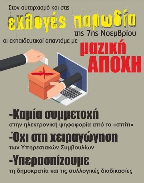Αντίθετα με νέο αντισυνδικαλιστικό νόμο που ετοιμάζεται να φέρει στη Βουλή η κυβέρνηση προωθεί την καθιέρωση της ηλεκτρονικής «ψηφοφορίας» για τις εκλογές των σωματείων και τη λήψη των αποφάσεων τους και ειδικά της απόφασης για απεργία, στο πλαίσιο ενός συνολικού σχεδίου να βαθύνει και να ισχυροποιήσει την επίθεση απέναντι στις συλλογικές διαδικασίες και τη λειτουργία των σωματείων. Ζητάμε ταυτόχρονη κατάργηση της τροπολογίας του Π.Δ. 1/2003 που ψηφίστηκε με το νόμο 4728/20 και της εφαρμοστικής Υ.Α. (Φ.350/52/139940) όπου ορίζεται η διεξαγωγή των εκλογών για την ανάδειξη αιρετών στα Υπηρεσιακά Συμβούλια με ηλεκτρονική ψηφοφορία αλλά και την απόσυρση των ψηφοδελτίων, από όλα τα υπηρεσιακά συμβούλια, στην οποία προχώρησαν οι παρατάξεις.