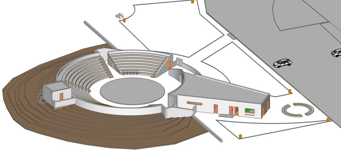 -μικρό κτίριο στο δυτικό τμήμα των κερκίδων που θα καλύπτει τις ανάγκες φωτισμού των σκηνικών και ηλεκτρολογικής υποστήριξης αυτών και θα μπορεί να χρησιμοποιηθεί και ως χώρος για τη μηχανή προβολής κινηματογράφου