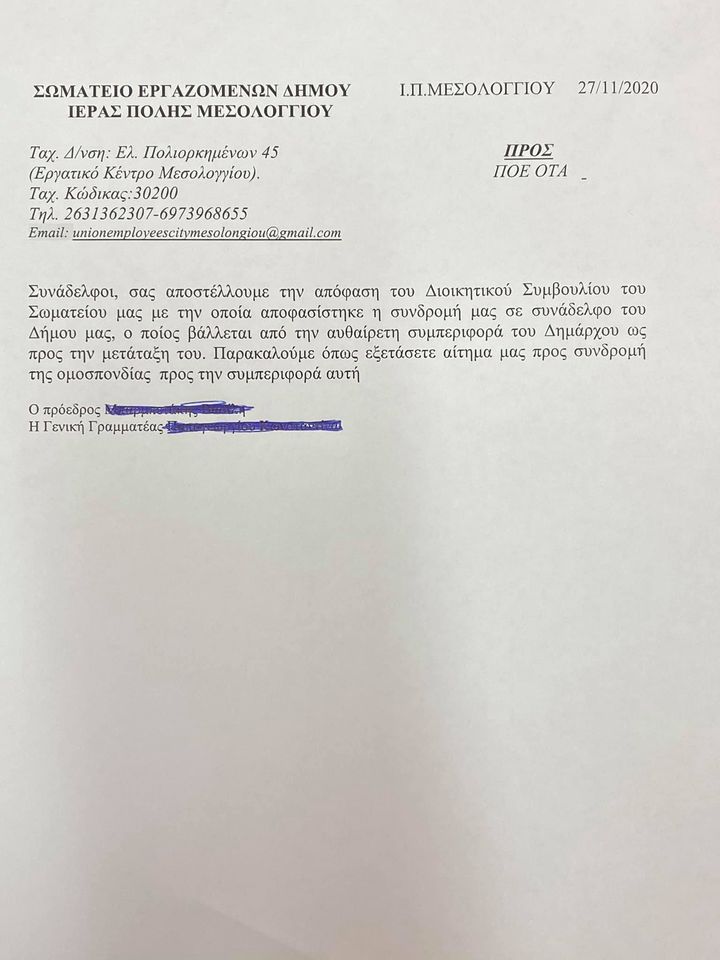 Το παρακάτω έγγραφο είναι από το Σωματείο Εργαζομένων Ι.Π. Μεσολογγίου, εάν ισχύει αυτό που διαβάζω κύριε Δήμαρχε, τότε τι να πω;;;