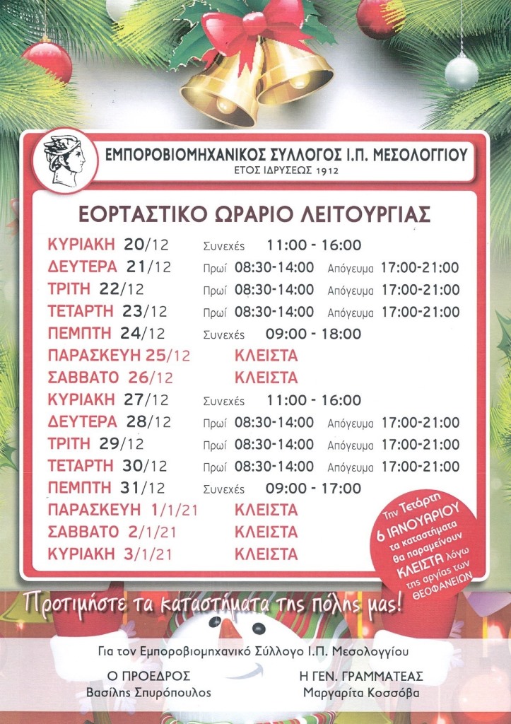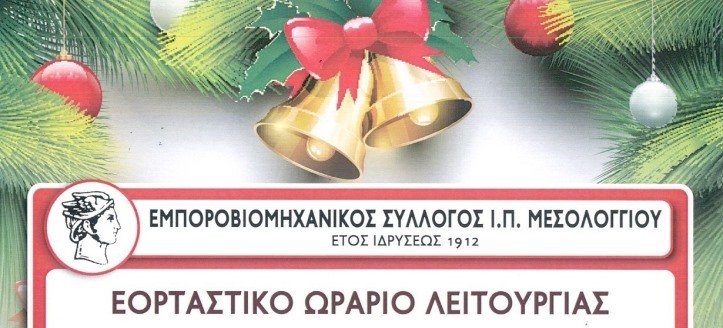 Εμποροβιομηχανικός Σύλλογος Ι.Π. Μεσολογγίου: Εορταστικό Ωράριο