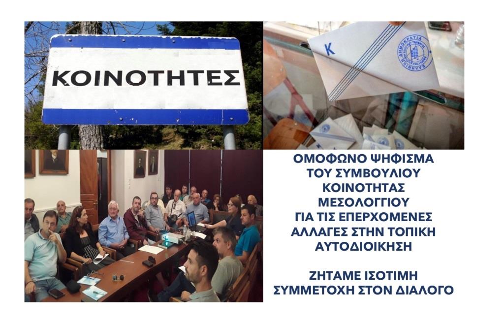 Με αφορμή αυτές τις εξελίξεις το Συμβούλιο Κοινότητας Μεσολογγίου στην συνεδρίαση της 17ης Δεκεμβρίου 2020 ομόφωνα ενέκρινε την έκδοση του παρακάτω ψηφίσματος που αποτελεί ταυτόχρονα ανοιχτή επιστολή προς το Υπουργείο Εσωτερικών και την ΚΕΔΕ και έχει υπογραφεί μέχρι στιγμής από 677 Κοινότητες από όλη την Ελλάδα.