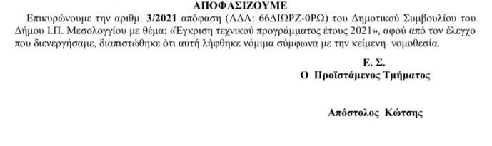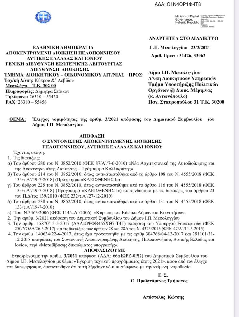 Η Αποκεντρωμένη προχώρησε στην επικύρωση της νομιμότητας, για το τεχνικό πρόγραμμα έτους 2021 του Δήμου Ι.Π. Μεσολογγίου και συνεπώς, η δημοτική αρχή θα πρέπει να υλοποιήσει, το τεχνικό πρόγραμμα της Αντιπολίτευσης.