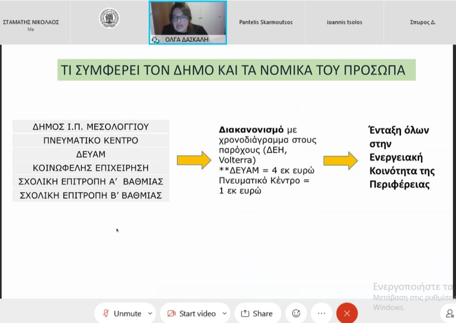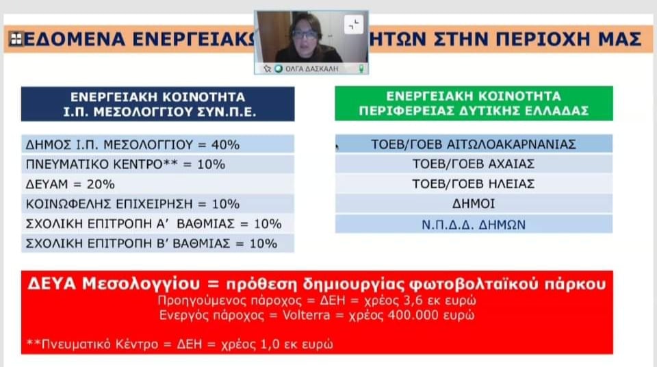 Ακολουθεί η παρουσίαση που έγινε από την Πρόεδρο του Συμβουλίου Κοινότητας Μεσολογγίου στο δημοτικό συμβούλιο. Σας προτρέπουμε ακόμη να δείτε και τη συνεδρίαση (22-01-2021) του Συμβουλίου Κοινότητας Μεσολογγίου με θέμα την Ενεργειακή Κοινότητα (https://fb.watch/4dEu_qod88/).