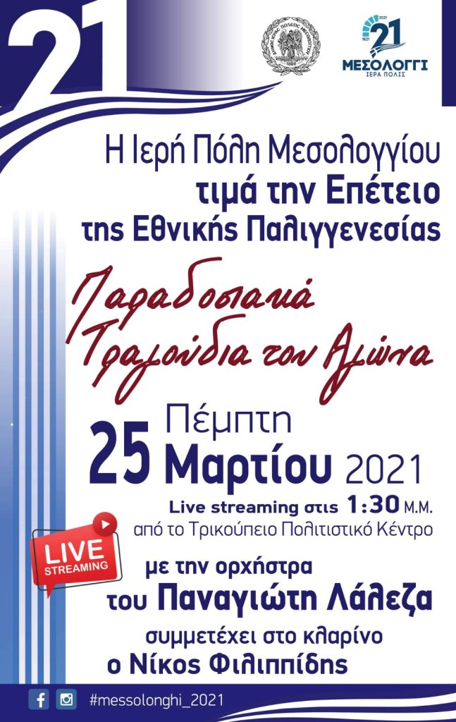 Η παρουσίαση θα γίνει μέσω διαδικτύου με τραγούδια εμπνευσμένα από την Ελληνική Επανάσταση του 1821, θα παρουσιαστεί ζωντανά από τα κανάλια του Δήμου στο youtube και το facebook.