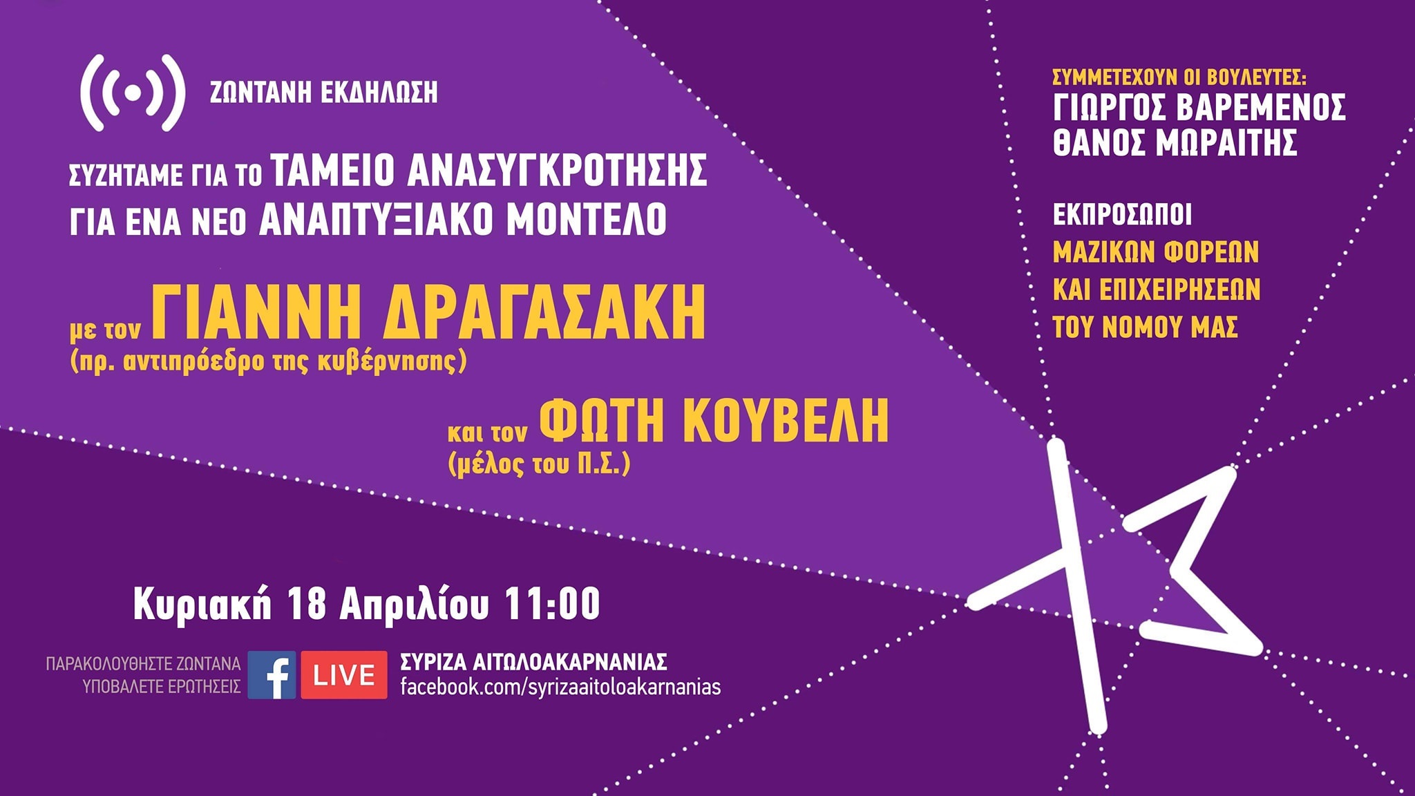 Ο Σύριζα Αιτωλοακαρνανίας, διοργανώνει την Κυριακή 18 Απριλίου και ώρα 11:00, διαδικτυακή συζήτηση με θέμα το Ταμείο Ανασυγκρότησης για ένα νέο «Αναπτυξιακό Μοντέλο».