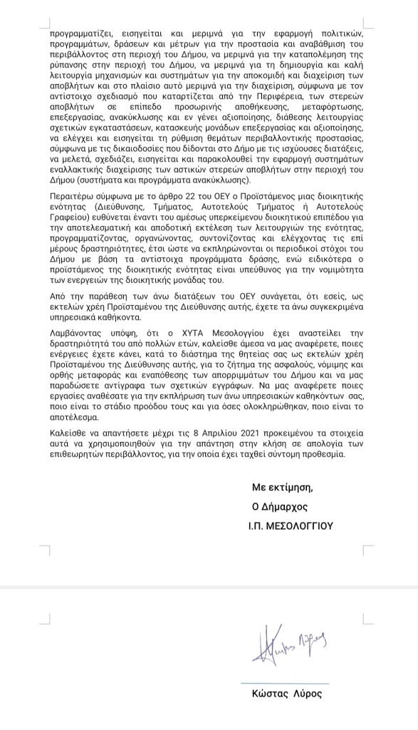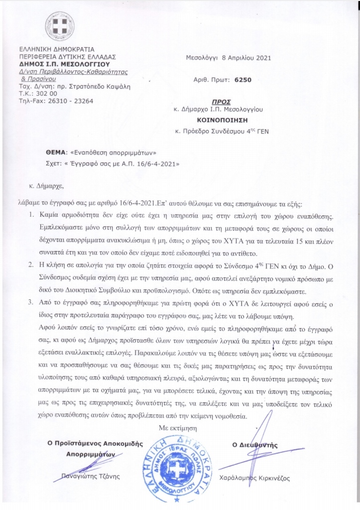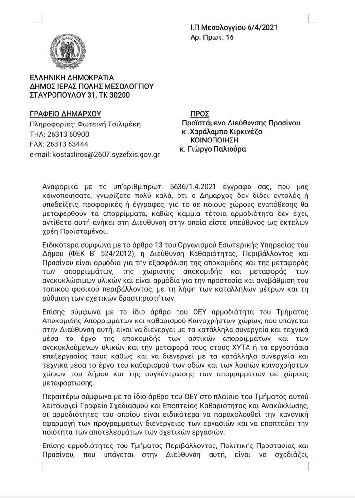 Με τις παρακάτω επιστολές γίνεται σαφές σε όλους πλέον, ότι ο δήμαρχος Ι.Π Μεσολογγίου επιχειρεί αποποίηση των ευθυνών του, ο οποίος αδειάζει στην κυριολεξία την Αντιδήμαρχο καθαριότητας.