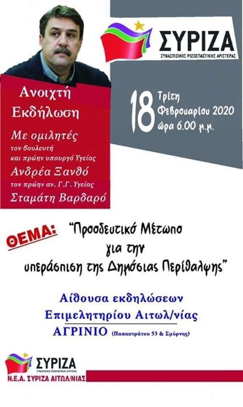Την Τρίτη 18 Φεβρουαρίου 2020 η Νομαρχιακή Επιτροπή Σύριζα Αιτωλοακαρνανίας διοργανώνει ανοιχτή εκδήλωση, στις 18.00 στην αίθουσα εκδηλώσεων του Επιμελητηρίου Αιτωλοακαρνανίας στο Αγρίνιο, με θέμα «Προοδευτικό μέτωπο για την υπεράσπιση της Δημόσιας Περίθαλψης».