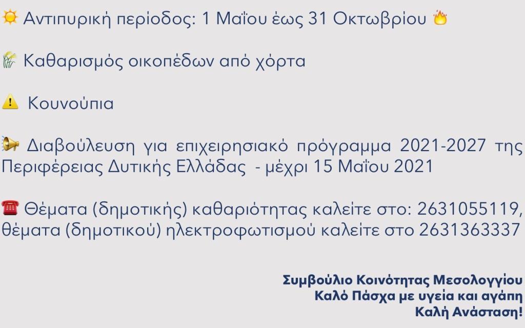 “Από 01- 05 – 2021 έως και 31 – 10 – 2021 α π α γ ο ρ ε ύ ε τ α ι, λόγω αυξημένης επικινδυνότητας, οποιαδήποτε χρήση φωτιάς στην ύπαιθρο. Λόγω των κλιματολογικών και καιρικών συνθηκών που επικρατούν κατά την διάρκεια της Αντιπυρικής περιόδου στη χώρα μας. Παρακαλούνται οι αγρότες, οι μελισσοκόμοι, οι κτηνοτρόφοι και όλοι οι κάτοικοι της Περιφερειακής Ενότητας Αιτωλοακαρνανίας, να μην εκτελούν εργασίες στην ύπαιθρο με χρήση φωτιάς, προς αποφυγή πρόκλησης πυρκαγιών από αμέλεια”