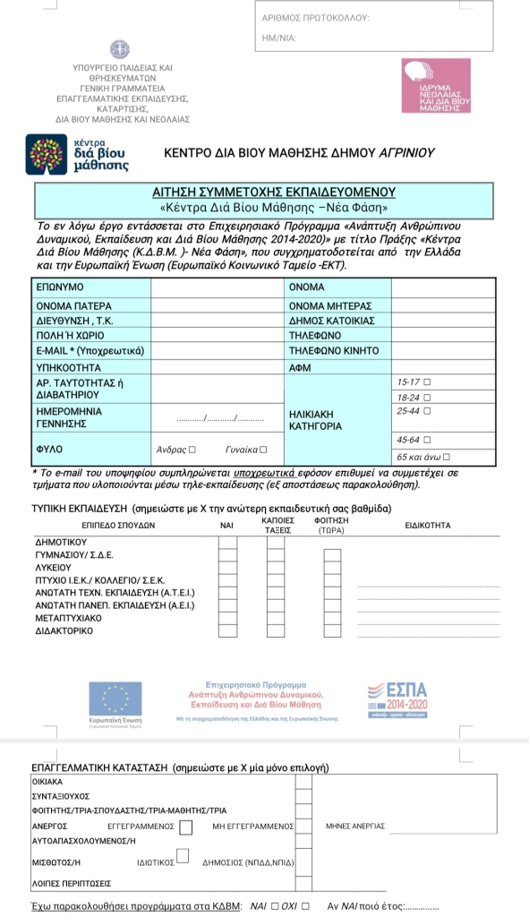 Ενημερώνουμε κάθε ενδιαφερόμενο/η ότι ο Δήμος Αγρινίου, το Υπουργείο Παιδείας και Θρησκευμάτων (διά της Γενικής Γραμματείας Επαγγελματικής Εκπαίδευσης, Κατάρτισης, Διά Βίου Μάθησης και Νεολαίας) και το Ίδρυμα Νεολαίας και Διά Βίου Μάθησης συνεχίζουν επιτυχώς τη λειτουργία του Κ.Δ.Β.Μ. του Δήμου Αγρινίου στο οποίο θα υλοποιηθούν προγράμματα Γενικής Εκπαίδευσης Ενηλίκων με εκπαιδευτικές δράσεις Εθνικής και Τοπικής Εμβέλειας.