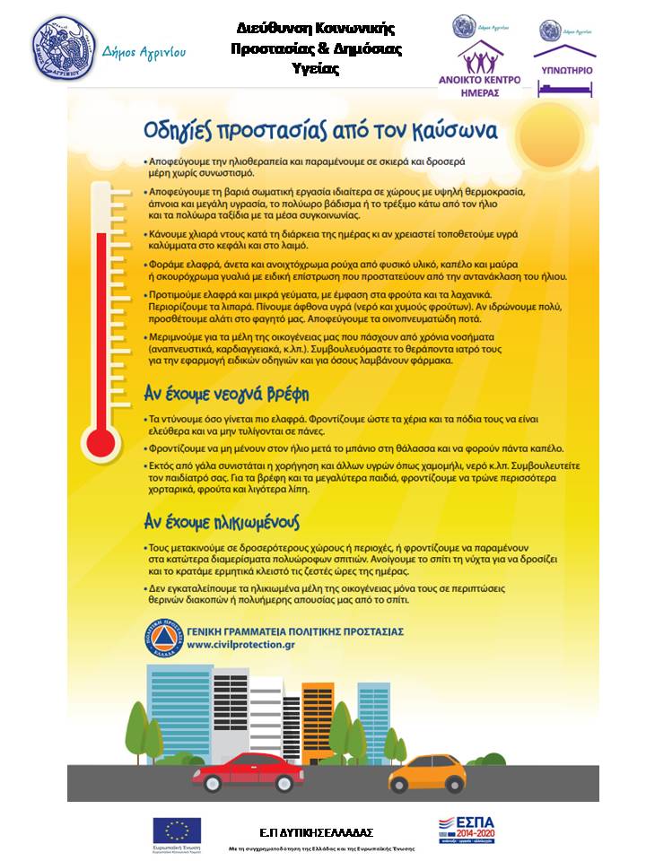 Το επιστημονικό προσωπικό θα διανέμει φυλλάδιο με οδηγίες για την προστασία από τον καύσωνα, παγωμένα νερά, χυμό, φρούτα καθώς υγρά μαντηλάκια καθαρισμού και αντισηπτικά για την προστασία από το Covid -19.