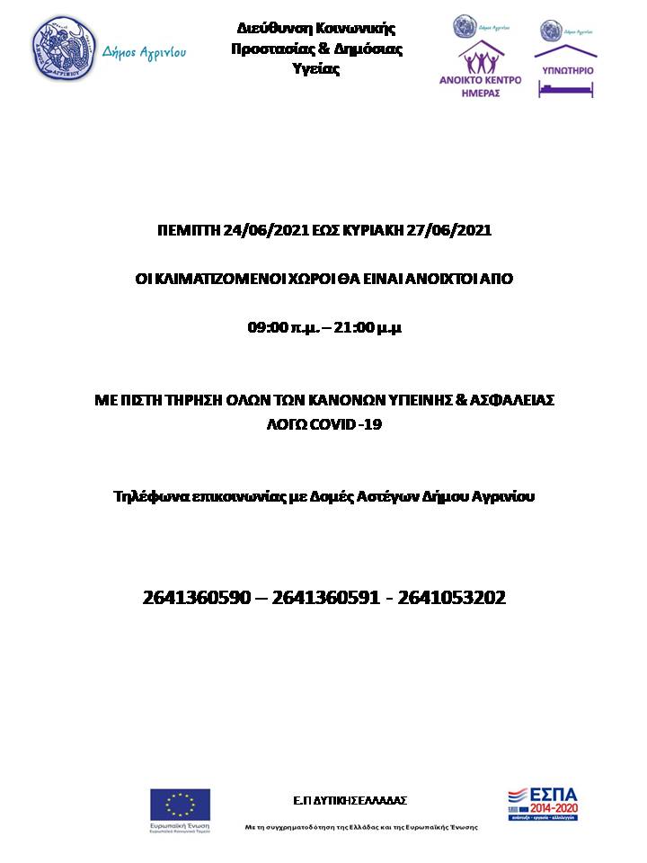 Επίσης, ενημερώνουμε ότι οι αίθουσες των Δομών Αστέγων (θέση 3 ο χλμ Αγρινίου Ιωαννίνων) λόγω του επερχόμενου καύσωνα είναι διαθέσιμες για διημέρευση την Πέμπτη 24/06/2021 κ Παρασκευή 25/06/2021 από 09:00 π.μ. έως 09:00 μ.μ με πιστή τήρηση όλων των κανόνων υγιεινής και ασφάλειας σύμφωνα με τις οδηγίες του Εθνικού Οργανισμού Υγείας για τον Covid -19.