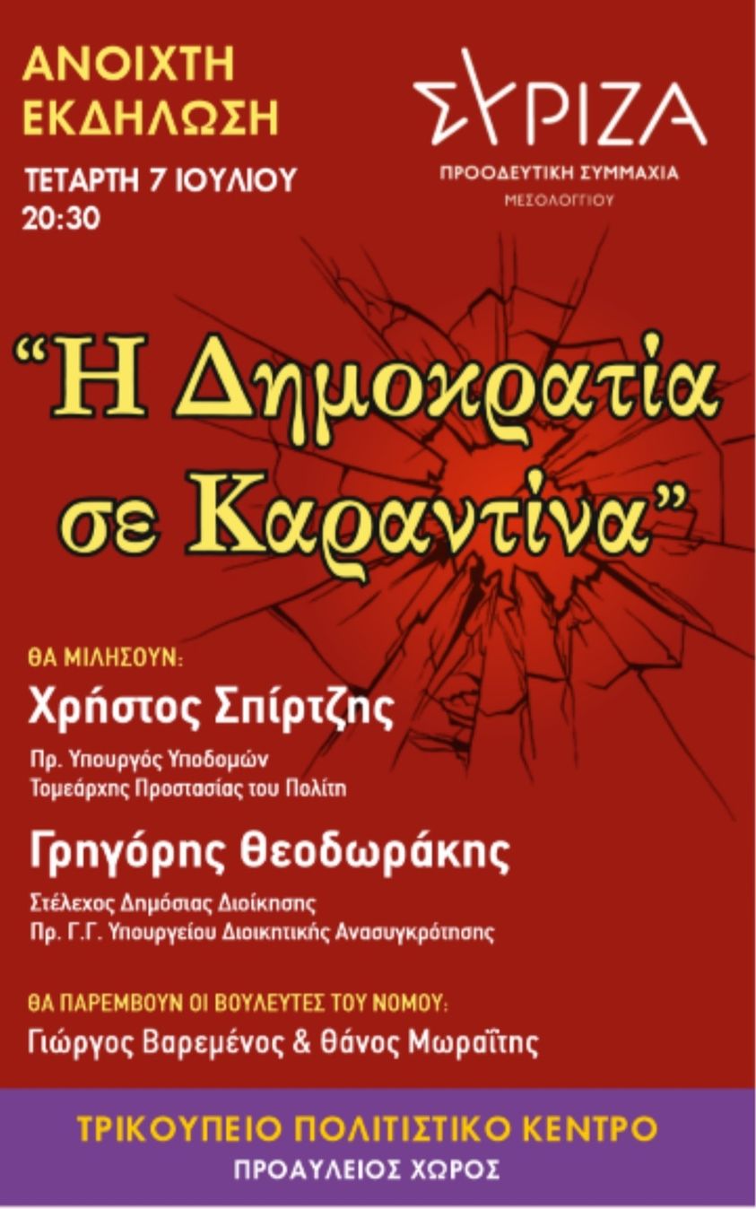 Ανοιχτή εκδήλωση θα πραγματοποιήσει ο ΣΥΡΙΖΑ - ΠΡΟΟΔΕΥΤΙΚΗ ΣΥΜΜΑΧΙΑ Μεσολογγίου την Τετάρτη 7 Ιουλίου στις 8:30μμ στο Τρικούπειο Πολιτιστικό Κέντρο (προαύλιο χώρο).