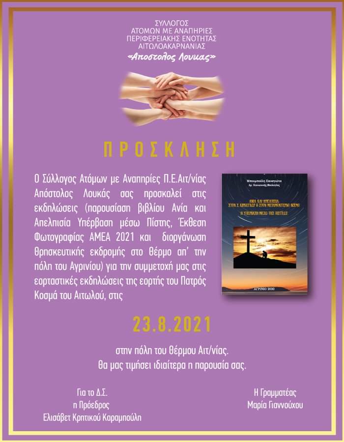 Ο σύλλογος ΑΜΕΑ Αιτωλοακαρνανίας «Απόστολος Λουκάς» την Δευτέρα 23 Αυγούστου και ώρα 11:00 σας προσκαλεί, παραμονή της εορτής του Αγίου Κοσμά του Αιτωλού στο Θέρμο, στην παρουσίαση του βιβλίου της Δρ.Κοινωνικης Θεολογίας Παναγιώτας Μπουμπουλη «Ανία και Απελπισία- Υπέρβαση μέσω Πίστης» και στην έκθεση φωτογραφίας ΑΜΕΑ 2021.
